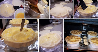 - Assemble pies. Remove dough circles from refrigerator, and brush surface evenly with egg wash. Place each circle egg-wash-side-down over a bowl, pressing lightly to seal overhanging crust to the side of the dish. Brush top surface of each pie with egg wash. Cut a little X in the middle of each pie to allow the steam to vent.