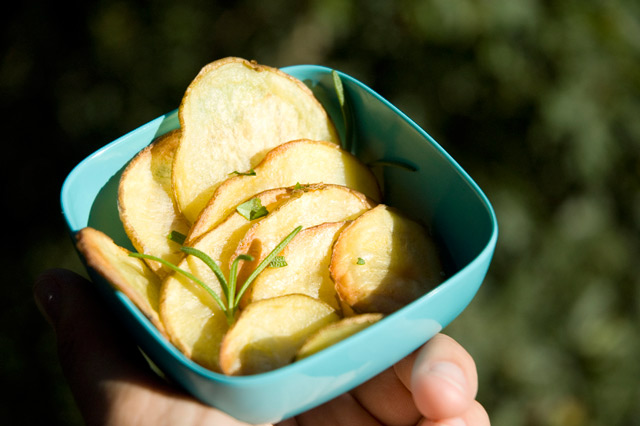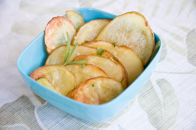 They were delicious and simple, and they seem like a healthier snack than the store-bought kind, because they’re fresh-baked without preservatives and I get to control how much salt and oil go into them. A lot of my chips stayed pretty flat, though, and only some had the best possible crunch, because my slices were on the thick side, and since I didn’t use a mandolin, they came out a bit uneven and the ones that got the best curly crispness were kind of funny-looking with a dark half and a light half. If you know what’s good for you, you’ll use a mandolin or some kind of slicey thing, or at least be a lot better at making thin slices than I am.