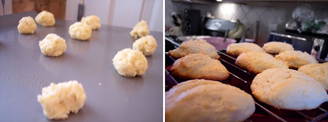My advice to you: Don’t grease the pan. Kate said not to but I didn’t have parchment paper so I tried a little b butter spray. Didn’t ruin anything, but it made the bottom brown a whole lot more than the top. They didn’t seem in any danger whatsoever of sticking to my teflon-coated cookie sheet even without the butter, so I imagine it’d be okay to skip this precaution altogether.