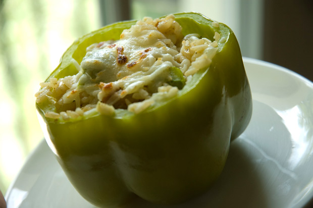 - Fill each pepper to the brim with the stuffing, then pour broth into the pepper to fill the gaps. Top with spices (and, optionally, mozzarella or Swiss cheese). Bake in the 400° oven for 15 minutes.