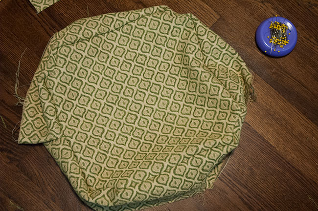 If you have these particular stools (and why wouldn’t you?) then you’re going to want more details on how the hell to sew those insane little concave corners. Damn it, so did I. It took until the third try before I came up with a strategy that worked: Mark a straight line on the wrong side of the long strip, then poke each pin into the marked line on one piece and find the line on the other piece; that’s where you’ll want your pin to poke through the other side. It’s…look, it’s hard to describe, but the idea is that you’ll pin it so that your marks always line up, and then the curve will be correct. If you can figure out what the hell I’m talking about, you’ll be golden, because it worked like a charm. I used this strategy on the green cushion and when I was done, I paraded it around the house like it was the newborn king of the Pride Lands.
