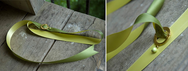 I made this decorative slide out of a little brass charm I had and a bead that matches my ribbon. The charm was a circle, so I wrapped some wire securely around its middle like a belt. After that, all I had to do was sew one end of the ribbon to the wire-belt-part I had just made, which took about ten stitches. Ten sloppy stitches. Because no one is going to see them and I’m not good at sewing.