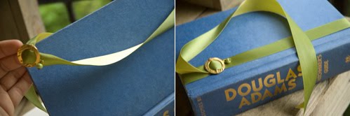 Step two: To put it on, just place the slide against the front of the book, wrap the ribbon over and behind the front cover, and bring the ribbon back up to the slide. Then thread the end of the ribbon upward through the slide so that it holds tight to the front cover (remember the bra straps!), and the loose ribbon is at the top of the book. Man… this is not easy to illustrate verbally. More pictures?