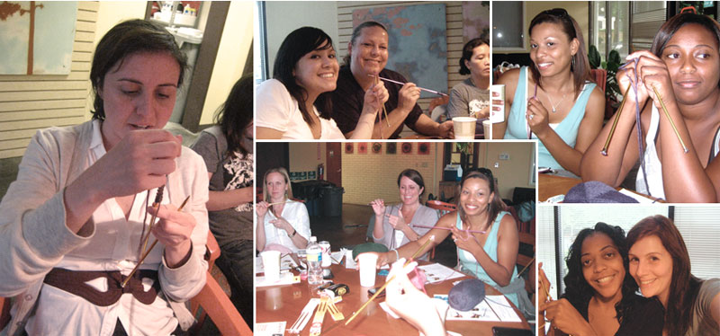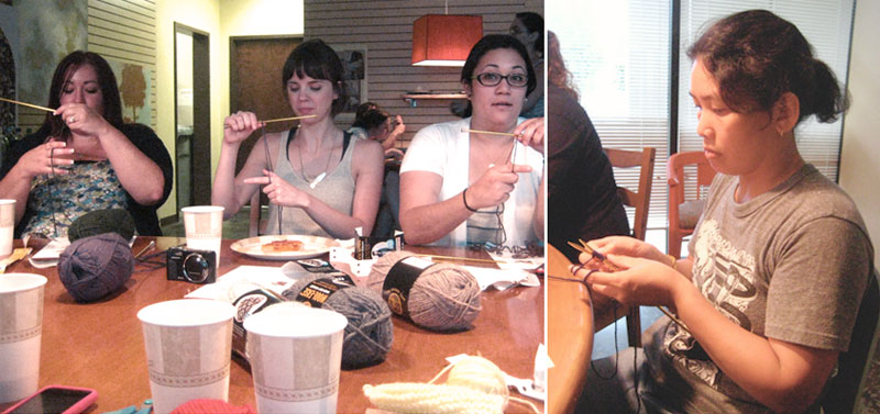 - Enthusiasm and pizza both go a long way toward making knitting fun to learn. The ladies at Alternative were great to hang out with, and they were willing to put up with a lot because they were so excited about what they were doing. That was really helpful when I was having trouble getting to everyone as quickly as I wanted to. I bet people who aren’t excited about knitting are really crappy to teach knitting to, so I probably wouldn’t teach it at, say, a summer camp where everyone is forced to choose a class, or, I don’t know, a mental facility where no one gets to decide on their own schedules.